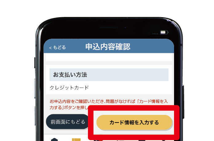 お支払い方法選択へ進むと、登録内容の確認とメールアドレス登録画面に進みます。「確認画面に進む」をタップすると、「カード情報を入力する」ボタンが出てきますので、タップしてください!その後、クレジットカード情報を入力してください!